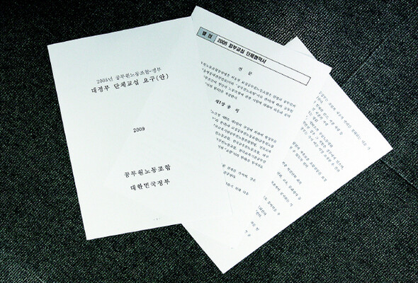 상생의 노사관계는 단체교섭을 거치면서 형성된다. 2007년 정부와 공무원노조가 체결한 ‘2006년 정부교섭 단체협약서’와 최근 준비교섭이 시작된 2008년 단체교섭의 노조쪽 교섭 요구(안).