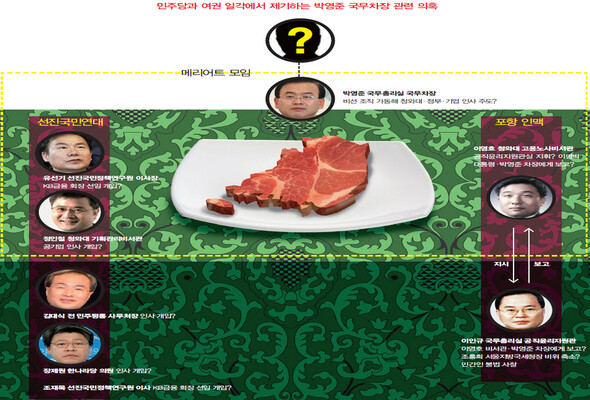 이런 가운데 정두언 한나라당 의원은 과 한 통화에서 “박 차장이 사무실을 (최근에도 총리실) 근처에 두고 거기서 인사 담당자를 만나고 있을 것”이라고 말해 인사 농단 의혹은 더욱 확산될 조짐이다. 지난해 7월 이후로 중단됐다는 ‘메리어트 모임’이 사실상 계속되고 있다는 주장이기 때문이다.