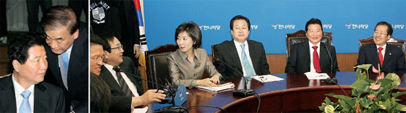 1월12일 한나라당 중앙위원회 신년하례회에 참석해 대화를 나누는 안상수 대표(왼쪽 사진 왼쪽)와 이재오 특임장관. 정치권에선 ‘정동기 사태’와 관련해 두 사람의 ‘밀약설’이 나돈다. 1월13일 서울 여의도 한나라당 당사에서 열린 최고위원회의. 당 최고위는 1월10일 비공개 회의 시작 15분 만에 정동기 전 감사원장 후보 부적격 의견을 청와대에 통보키로 결정했다(오른쪽).