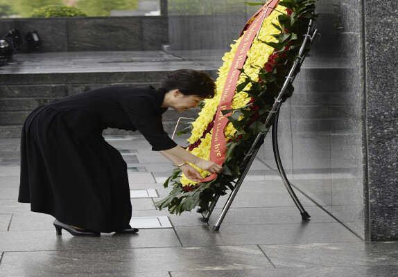 박근혜 대통령이 지난 9월9일 베트남 하노이의 호찌민 전 국가주석 묘소를 찾아 헌화하고 있다. 그는 베트남 방문 도중 ‘변하지 않는 것으로 모든 변화하는 것에 대응한다’는 뜻의 호 전 주석의 좌우명 ‘지벗비엔 응번 비엔’을 인용하기도 했다. 그러나 베트남전쟁에 대해서는 아무런 언급을 하지 않았다.