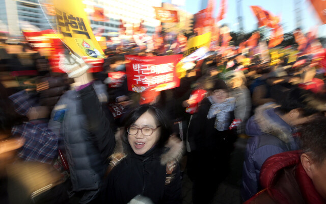 탄핵 표결을 전후한 8일과 9일 여의도의 촛불집회에서 현재를 이야기하는 사람은 많지 않았다. 청산하지 못한 과거와 현재와는 달라야 할 미래를 이야기했다. ‘박근혜 탄핵’이라는 정치적 요구를 성취한 시민들은 다음 순서가 ‘새누리당 해체’라고 했다. 친일파 청산, 부역자 청산이라는 1945년 해방 정국의 언어가 다시 등장하고 있었다. 탄핵 표결이 진행 중이던 9일 오후 ‘중구·성동맘 카페’ 회원 3명은 얼굴에는 선글라스, 손에는 비닐장갑을 낀 채 귤이 얼마 남지 않은 대형 비닐봉지를 앞에 두고 있었다. 세월호 유가족들이 가는 곳마다 떡, 김밥, 음료수 등을 지원하는 이 여성들은 백남기 농민의 서울대병원을 거쳐 이날 본회의장 방청을 위해 국회를 찾은 세월호 유가족에게도 간식을 제공했다. 이들은 “150인분 중 80인분은 세월호 유가족들에게 드리고 70인분은 트랙터를 타고 온 농민분들한테 드렸다”고 들떠서 말했다. 기자들도 탄핵 가결을 확신하지 못하는 긴장의 와중에 이들은 “탄핵 가결은 확실하다. 이제 새누리당 압박을 시작해야 한다”고 말했다.