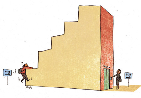 물론 중산층 전업주부들도 자아실현을 위해 일자리를 찾지만 대부분 자아실현과는 거리가 먼 궂은 일자리다. 기대 수준을 한참 낮추면서까지 재취업할 까닭이 없다. 실제 한국 여성의 경제활동 참가율은 30대 초반에 가장 낮다가 30대 후반이나 40대 초반에 다시 높아지는 M자형 구조를 보인다. 고학력 여성은 20대 중반에 고용률이 가장 높았다가 결혼과 출산 뒤 다시 높아지지 않는 L자형이 굳어지고 있다.