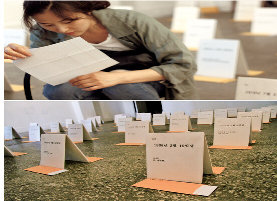 생일이 붙은 텍스트가 봉투에 담겨 전시됐다. 여기엔 소소한 일상, 그날의 사건이 담겼다. ‘1981년 2월18일생- 살다보면 이렇게 좋은 일도: 416,000원인데 6,000원만 내었단다.’ 이렇게 아들이 장학금을 받고 대학에 입학한 날도 있었고, 엄마가 아픈 외손녀가 애처로운 어느 날도 있었다. ‘우리 집에서 밥을 먹는 것. 아픈 엄마를 도와주는 것이라고.’ 당시는 몹시도 가슴이 아팠던 이별의 흔적도 있다. ‘연이를 보낸다. 온 식구가 울음바다. 약 20, 신 100, 크림 100, 돈 280… 약을 사고 신도 사고 보낸다.’ 13살 ‘식모’ 연이를 보내며 썼던 글이다. 겉으로 내색하지 않았던 기다림도 있었다. ‘딸자식은 섭섭하기만! 종일 기다려도 오지 않음.’ 세월이 흘러 지인의 부음을 듣던 날은 이랬다. ‘1988년 6월10일생- 어안이 벙벙: 이제는 우리 차례가 왔다는 느낌.’ 이제는 잊혀진 사건도 여기선 오늘의 일이다. ‘1997년 8월6일생- 225명 사망, 29명 생존. 대한항공 여객기 괌 추락.’ 무엇보다 손녀의 마음을 움직인 텍스트는 이랬다. ‘2002년 4월18일생- 죽음도 출생의 기쁨과 같단다: 마음먹기에 따라.’
