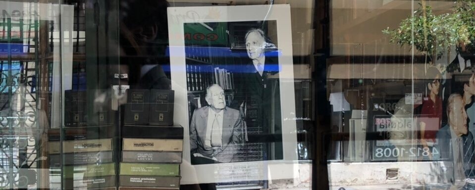 아르헨티나 부에노스아이레스에 있는 길거리 서점에서 호르헤 루이스 보르헤스와 아돌포 비오이 카사레스가 함께 찍은 사진을 발견했다. 두 사람은 공동으로 가명 추리소설을 썼다. 사진 신동호 제공