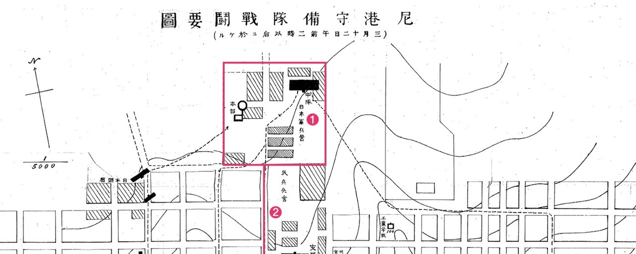 일본군이 작성한 ‘니콜라옙스크 수비대 전투지도’.(1920년 3월12일 이후) ①일본군 병영 위치 ②일본군 주력의 기습 공격 방향 ③적위군 본부 소재지 ④일본군 별동대 고토 대위가 이끄는 11중대 출발지 ⑤고토 부대의 진격로 ⑥대한독립군의 숙영지