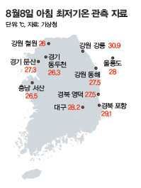 또다시 기록을 갈아치웠다. LA 다저스에 있는 류현진이 아닌, 요즘 날씨 얘기다. 특히 폭염에 ‘초열대야’라는 단어까지 등장한 8월8일은 폭염의 ‘역사적 순간’이기도 했다. 원래 우리 기상청에 열대야는 ‘전날 저녁 6시1분부터 다음날 오전 9시까지 최저기온이 25℃ 이상인 날’을 뜻하고, 최저기온 30℃가 넘는 ‘초열대야’라는 용어는 없었다고 한다. 그러나 8월8일 아침, 강원도 강릉시의 아침 최저기온이 30.9℃를 기록하면서 우리도 ‘초열대야’ 있는 나라가 됐다. 전국적으 로 관측 기록 최고치가 줄줄이 뒤바뀌었다. 경북 포항(29.1℃)·대구(28.2℃) 등 10곳에서는 가장 높았던 아침 최저기 온 기록이 경신됐고, 울산(38.6℃)·경북 울진(37.8℃)·울릉도(35.4℃)는 일일 최고기온의 최고치를 새로 썼다. 무더위 가 한동안 계속 이어진다던데… 아, 달갑지 않은 ‘최고’의 기록이여.
