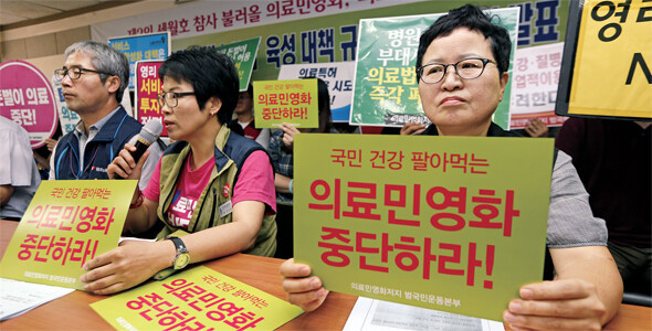 정부가 ‘보건의료 투자활성화 대책’을 발표한 다음날인 8월13일 보건의료노조·인도주의실천의사협의회 등 100여 개 노동·시민단체가 모인 ‘의료민영화·영리화 저지와 의료공공성 강화를 위한 범국민운동본부’ 회원들이 서울 중구 정동 민주노총에서 정부를 규탄하는 기자회견을 열고 있다. 김명진 기자