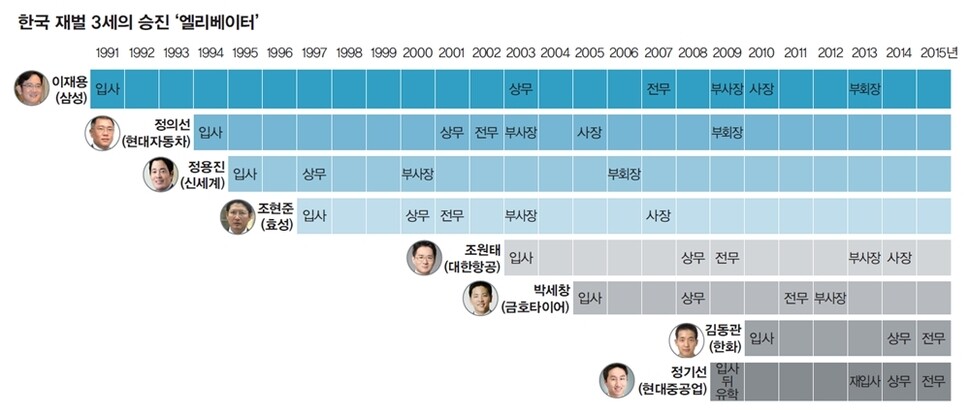 정씨와 김씨가 1년 만에 전무로 오르는 ‘초고속 엘리베이터’ 승진은 이전 재벌가 총수 자녀의 승진보다 빠르거나 비슷한 수준이다. 지난해 가 국내 주요 15개 그룹 재벌 3세 28명의 평균 첫 임원 승진 나이를 조사한 결과를 보면, 이들이 ‘기업의 별’인 임원 직함을 단 나이는 평균 31.2살이었다. 10년 전인 2005년 조사에선 국내 12개 그룹 재벌 3·4세 36명의 첫 임원 승진 나이가 평균 32.8살이었다. 경제민주화 바람이 분 지 10년이 흘렀어도 재벌들은 여전히 정기선 전무와 김동관 전무 같은 총수 자녀들을 30대 초반에 임원으로 앉히고 있는 것이다.