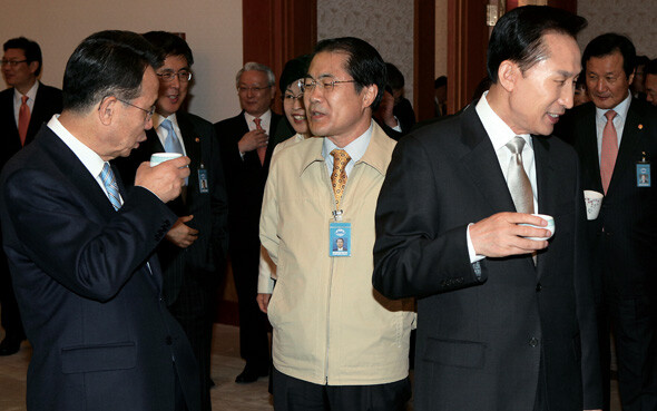 장태평 농림수산식품부 장관(가운데)의 옷차림은 난해했다. 앙드레김 선생님의 어법을 빌리면 ‘엘레그앙쓰’한 와이셔츠에 ‘빤따스띡’한 넥타이를 맨 뒤, 느닷없이 ‘잠바때기’를 뒤집어쓴 모양새다. 앞뒤가 안 맞는 ‘장태평 스타일’이 스스로도 멋쩍었던 것일까. 3월10일 국무회의 직전 한승수 국무총리(왼쪽) 앞에 선 장 장관의 표정 또한 애매하다.