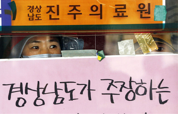 홍준표 경남도지사의 폐업 발표로 103년의 역사를 자랑하는 진주의료원이 지난 5월29일 문을 닫았다. 폐업을 발표하자마자 경찰과 경상남도 공무원들은 진주의료원의 모든 출입구를 막고 드나드는 사람과 물품을 감시하고 있다. 경상남도는 의료원에서 농성을 하고 있는 노조원 71명에게 문자메시지로 해고 통보를 했고 출입금지 명령을 내렸다. 노조원들이 진주의료원 로비 창문을 통해 밖을 보고 있다. 그들의 눈빛이 우리가 이제까지 해온 공공의료가 어디로 가는지 묻고 있는 듯하다.