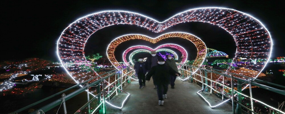 겹겹의 하트가 터널을 이룬 충남 태안군 남면 마검포길 태안빛축제 행사장을 찾은 한 가족이 2022년 1월26일 형형색색의 빛을 따라 걷고 있다. 전북 군산에서 온 이 가족은 “아름다운 불빛에 반해 해마다 이곳을 찾고 있다”고 말했다. 태안꽃축제추진위원회가 2013년부터 주최한 태안빛축제는, 코로나19가 전국적으로 확산된 2020년 이후 몇 차례 운영이 중단되기도 했다. 1년 내내 열리는 빛축제는 해가 지는 시간에 따라 입장 시간이 달라져, 2월 한 달 동안은 저녁 6시부터 9시30분까지 입장이 가능하다.