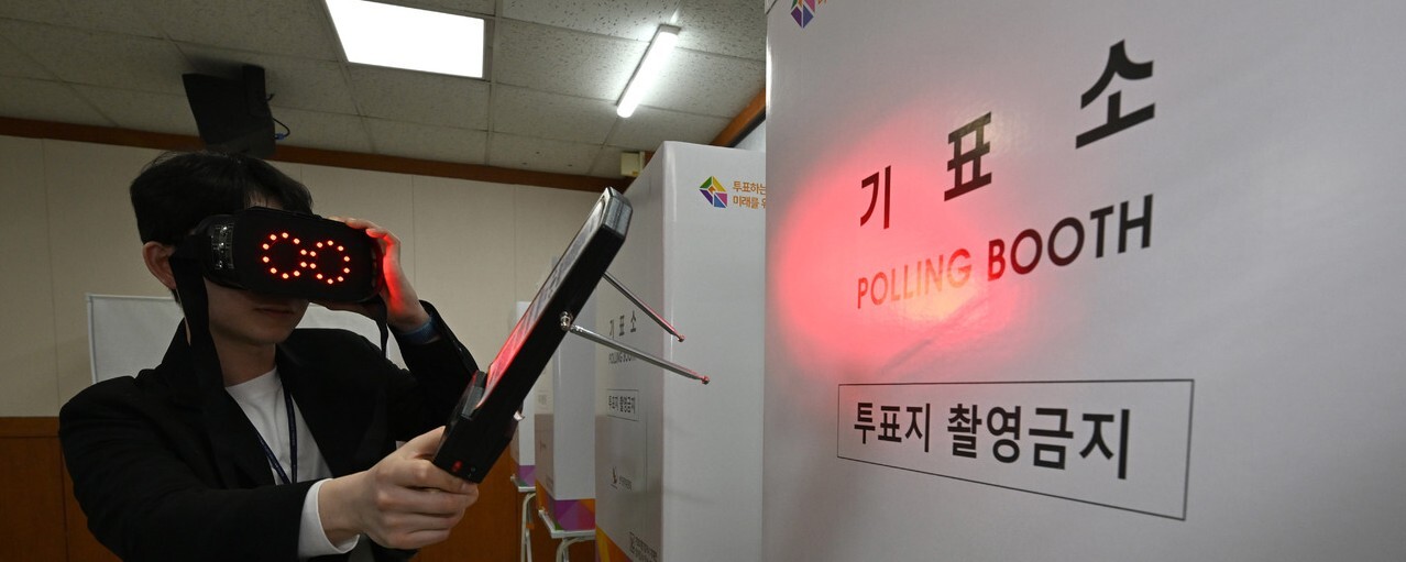 제22대 국회의원선거 사전투표를 하루 앞둔 2024년 4월4일 오후, 서울 강남구 삼성2동 사전투표소에서 선거관리위원회 관계자들이 카메라 탐지기와 금속 탐지기를 이용해 불법 카메라가 설치됐는지 점검하고 있다. 최근 전국 사전투표소 30여 곳에서 몰래 설치한 불법 카메라가 발견되자 이루어진 점검이다.
