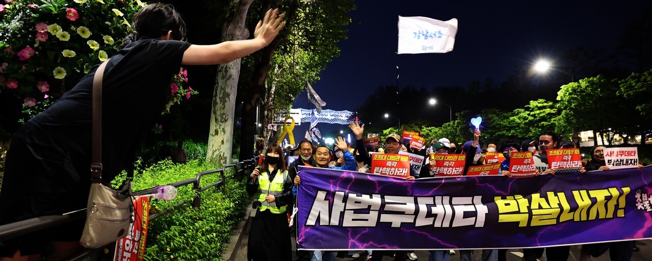 수많은 시민이 12·3 비상계엄 뒤 서울 여의도 국회, 남태령, 한남동, 광화문 등에서 혹한과 불면의 밤을 견디며 헌정 질서를 지켜냈다. 이번에는 대법원 앞에서 응원봉을 들었다. ‘민주정부건설 내란세력 청산 긴급 촛불대행진’이 2025년 5월7일 저녁 서울 서초구 대법원 앞에서 열렸다. 참석자들은 ‘대법관 10명을 처벌하자' ‘사법쿠데타 박살 내자' 등의 구호를 외치며 조희대 대법원장 등의 탄핵을 촉구했다.