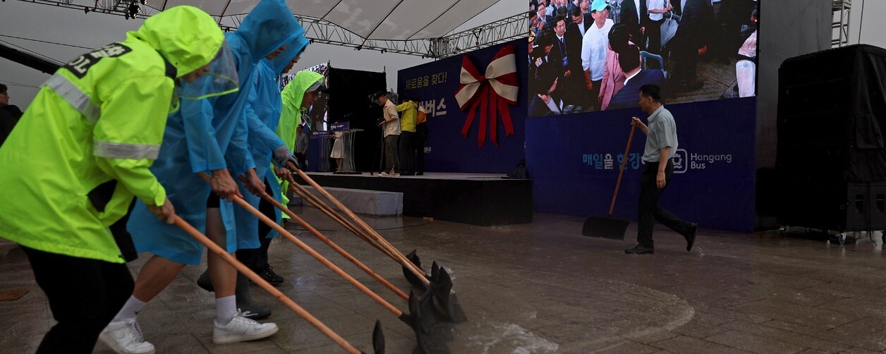 세 차례 연기 끝에 한강버스 취항식이 열린 2025년 9월17일 오전 서울 여의도 선착장. 행사 시작 전부터 굵은 빗줄기가 쏟아지며 행사장은 순식간에 물바다가 되었고, 관계자들은 넉가래로 물을 밀어내느라 분주했다. 모자를 쓴 오세훈 서울시장은 내빈과 인사를 나누며 입장했으나(오른쪽 화면), 시민과 취재진이 함께하는 시승 행사는 덕담 속 그 ‘비’로 인해 시계 1㎞를 확보하지 못해 취소됐다.