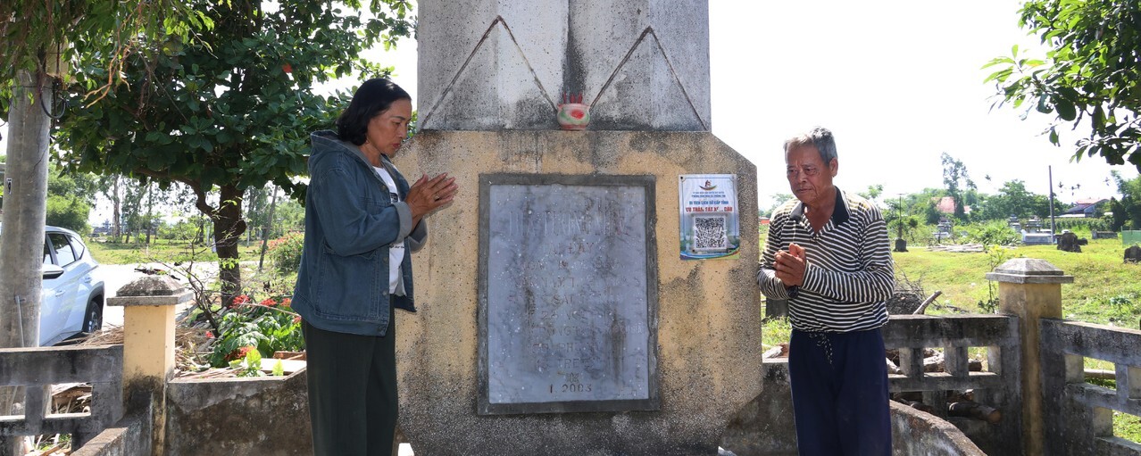 베트남 꽝남성 반꾸엇 학살 생존자 응우옌티씨와 쯔엉떤트엉이 2025년 4월28일 당시 숨진 가족들의 이름이 새겨진 위령비 앞에서 두 손을 모아 추모하고 있다.