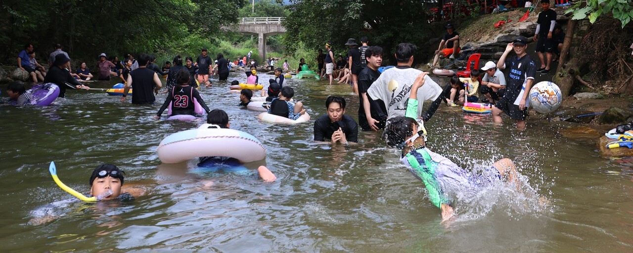2025년 8월 첫째 주말인 2일 경기도 양평군 옥천면 신복천에서 오윤상(앞줄 오른쪽)군이 물속에서 공중제비를 돌며 공을 차고 있다. 뒤쪽에서 시민들이 아이들과 어울려 놀고 있다.