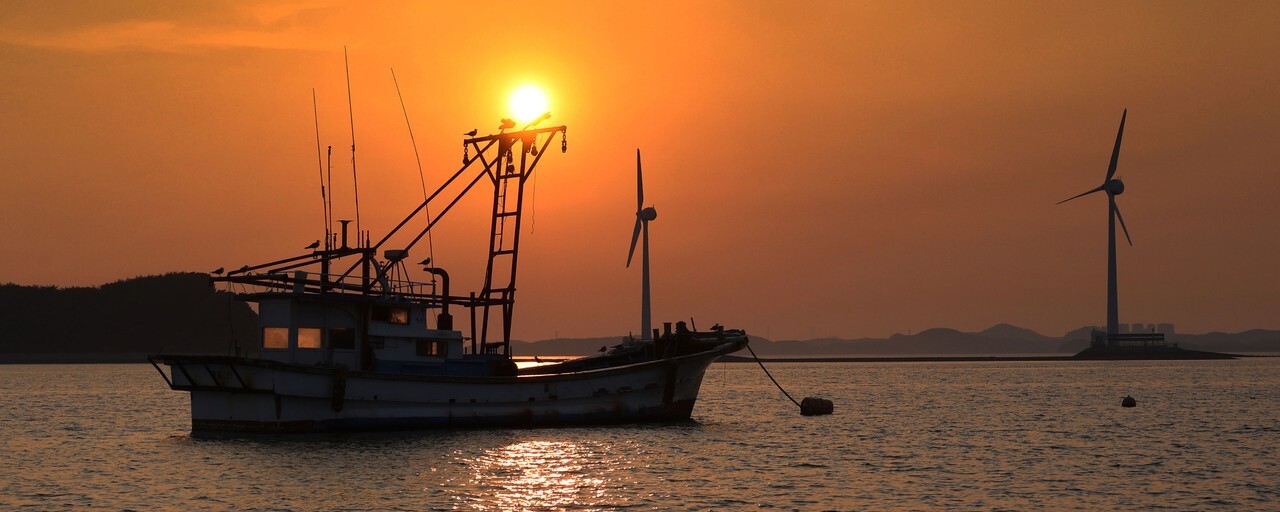 경기도 화성시 서신면 전곡항 앞바다에서 2025년 9월11일 누에섬과 풍력발전기 사이로 해가 넘어가는 동안 안강망 어선 한 척이 그 앞을 지나고 있다.