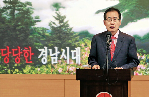 홍준표 경남도지사가 지난 5월29일 경남 창원시 사림동 경남도청에서 진주의료원 폐업에 대한 입장을 발표하고 있다. 한겨레 이정아 기자