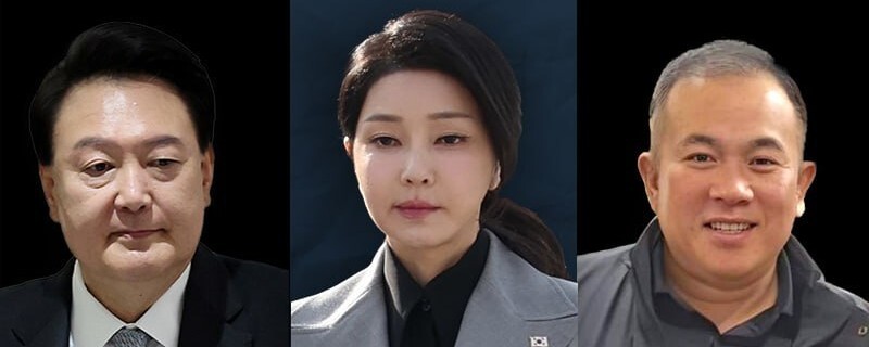 내란죄 피고인인 대통령 윤석열과 김건희 여사, 명태균씨.(왼쪽부터) 한겨레 자료사진