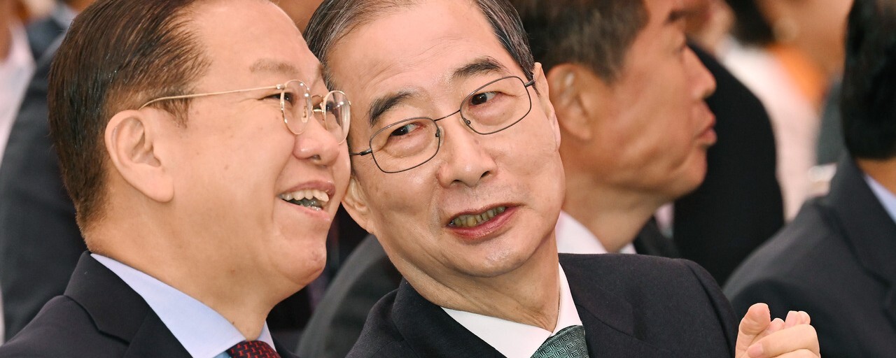한덕수 무소속 대선 예비 후보가 2025년 5월5일 서울 종로구 조계사에서 국민의힘 권영세 비상대책위원장과 대화하고 있다. 연합뉴스