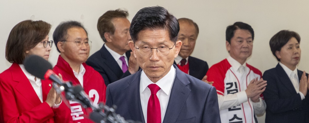 김문수 국민의힘 대통령 후보가 대선 패배가 확실해진 2025년 6월4일 새벽 서울 여의도 당사에서 입장을 밝히기 위해 단상으로 향하고 있다. 공동취재사진
