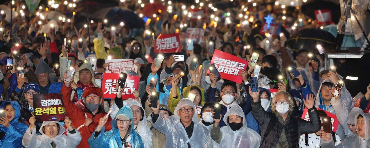 2024년 11월16일 오후 서울 종로구 광화문 광장 앞에서 열린 윤석열·김건희 부부 비판 집회에서 시민들이 휴대전화 빛을 켜서 들고 있다. 한겨레 김영원 기자
