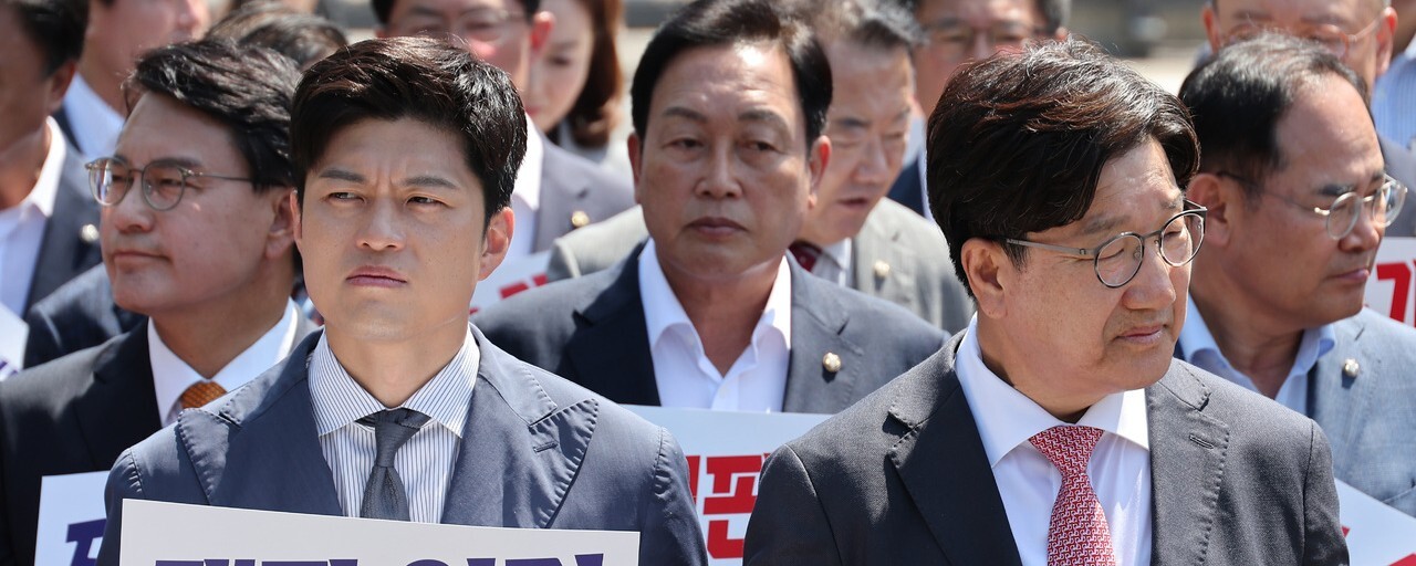 국민의힘 김용태 비상대책위원장과 권성동 원내대표가 2025년 6월11일 이재명 대통령의 공직선거법 위반 사건의 파기환송심을 사실상 무기한 연기한 서울고등법원 앞에서 열린 현장 의원총회를 마무리하고 있다. 연합뉴스
