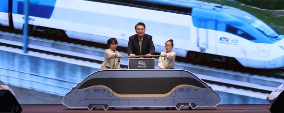 2024년 4월1일 당시 대통령 윤석열이 대전 동구 한국철도공사 본사에서 열린 케이티엑스(KTX) 개통 20주년 기념식에서 참석자들과 함께 기념 퍼포먼스를 하고 있다. 대통령실사진기자단