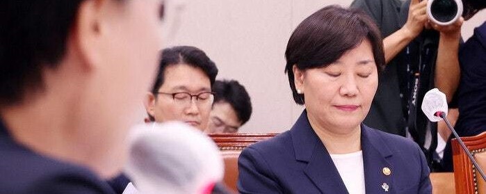 이재명 정부에서 유임된 송미령 농림축산식품부 장관이 2025년 6월25일 국회 농림축산식품해양수산위원회 전체회의에서 전종덕 진보당 의원으로부터 자진 사퇴 요구를 받고 있다. 연합뉴스