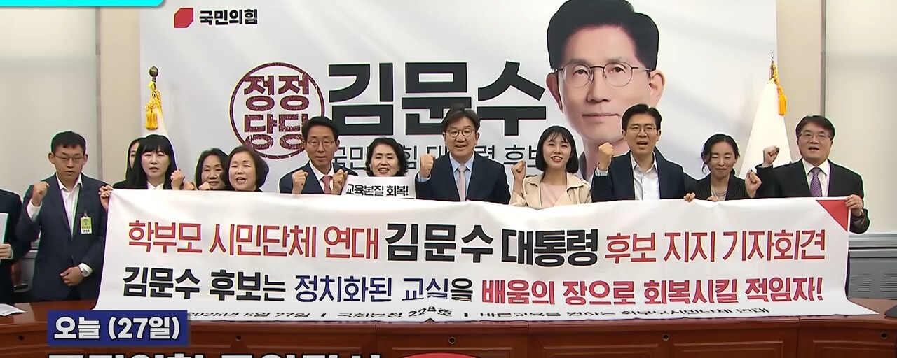 2025년 5월27일 국회에서 조정훈 국민의힘 의원 등이 ‘학부모 시민단체 연대’라는 이름을 건 리박스쿨과 김문수 대통령 후보 지지 기자회견을 하는 모습. TV조선뉴스 갈무리