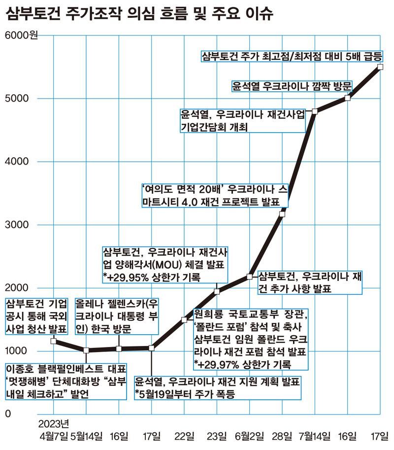 이종호가 말한 대로 이후 삼부토건은 ‘체크’할 게 많은 호재의 연속으로 이어진다. 이종호 발언 이틀 뒤인 5월16일 우크라이나 대통령 부인인 올레나 젤렌스카 여사가 방한한 것을 시작으로 5월17일에는 윤석열이 직접 ‘우크라이나 재건 지원 계획’을 발표한다. 5월22일에는 삼부토건 대표가 원희룡 국토부 장관과 함께 폴란드에서 열린 ‘우크라이나 포럼’에 참석한다. 다음날에는 전쟁 피해 지역 3개 도시를 재건하는 업무협약을 체결한다. 이 사흘 내내 삼부토건 주가는 상한가를 기록했다. 6월에는 삼부토건이 우크라이나 재건 추가 사항을 발표하고 6월28일 폴란드 바르샤바에서 ‘우크라이나 스마트시티4.0 재건 프로젝트’를 발표했다. 그러면서 주가는 3천원을 돌파한다. 7월14일 윤석열이 우크라이나 방문에 앞서 ‘우크라이나 재건사업 기업간담회’를 열었는데, 최대 수혜 기업으로 꼽혔던 삼부토건은 당일 주가가 4천원을 넘어섰다. 호재는 이후에도 끝없이 이어졌다. 우크라이나를 깜짝 방문하고 돌아온 윤석열이 7월18일 주최한 국무회의에서 “한국 기업들의 안전한 우크라이나 입출국과 현지 활동 등을 전방위로 지원하라”며 ‘공적개발원조(ODA)와 대외경제협력기금(EDCF) 증액 집행절차 간소화, 정부와 기업 경제사절단 파견 등 우크라이나 재건사업에 대한 구체적 지원방안’을 언급했다. 그러자 삼부토건은 최고가인 주당 5500원을 달성했다.
