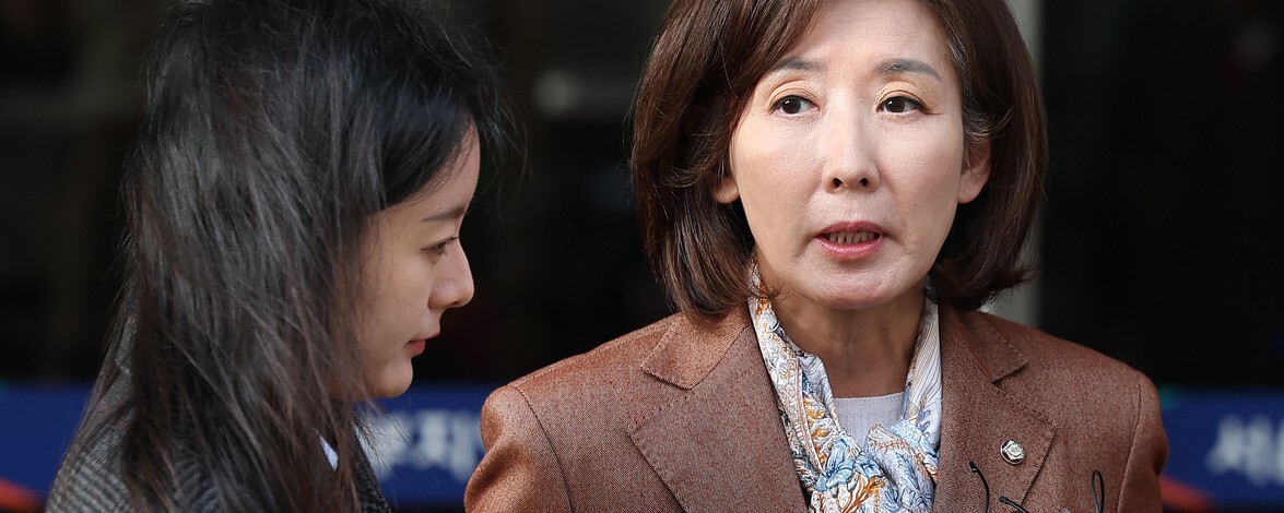 나경원 국민의힘 의원이 2025년 11월20일 서울 양천구 서울남부지방법원에서 열린 ‘국회 패스트트랙 충돌' 1심 선고 공판을 마친 후 나서며 취재진 질문을 받고 있다. 연합뉴스