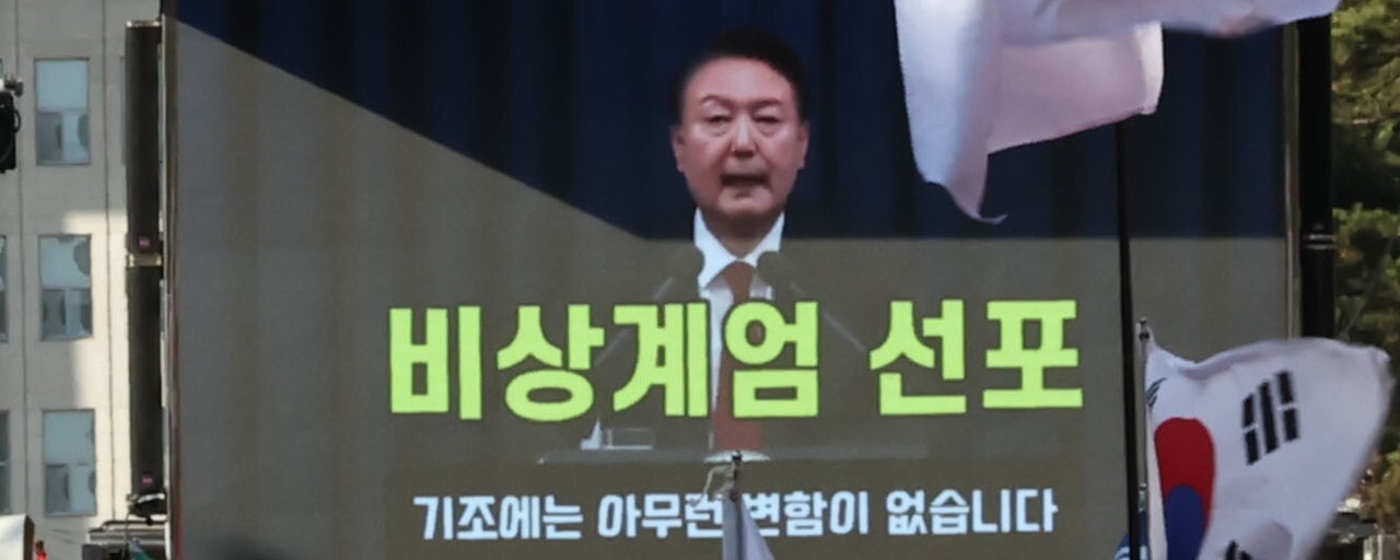 12·3 비상계엄 1주년인 2025년 12월3일 서울 여의도 국회의사당역 3번 출구 앞에서 신자유연대 주최로 열린 이재명 대통령 재판 재개 촉구 집회에서 윤석열의 비상계엄 선포 영상이 재생되고 있다. 연합뉴스