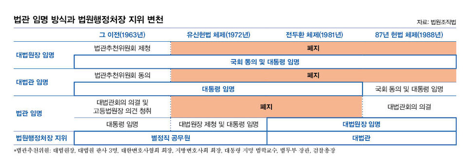 대법원장·대법관을 임명할 때 대법원장·대법관 3명 등 법원 내부 인사는 물론 변호사협회·법학교수 등 외부 인사들도 참여하는 법관추천위원회를 거쳐야 했던 제도는 1972년 유신헌법 개정 때 사라졌다. 법관을 임명할 때 의무화했던 ‘고등법원장 의견 청취’ 절차도 이때 함께 사라졌다. ㄴ변호사는 “제4공화국 때 대통령이 대법원장을 통해 법원 인사권을 휘두르려는 목적으로 대법원장 권한을 막강하게 키워놨다. 대법관이 법원행정처장을 맡게 된 것은 제5공화국 때부터”라며 “내부 견제나 민주적 정당성 확보 장치 없이 대법원장·법원행정처장 등 몇몇 법관의 비정상적이고 이례적인 권한 강화를 ‘사법부 독립’이라고 포장해선 안 된다”고 말했다.
