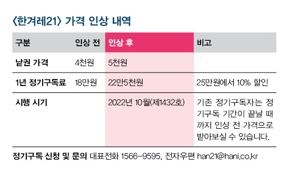 2022년 10월3일(제1432호)부터 <한겨레21> 낱권 판매가격이 현행 4천원에서 5천원으로 오릅니다. 연간 정기구독료는 1년 기준 기존 18만원(정가 20만원에서 10% 할인가)에서 22만5천원(정가 25만원에서 10% 할인가)으로 오릅니다.