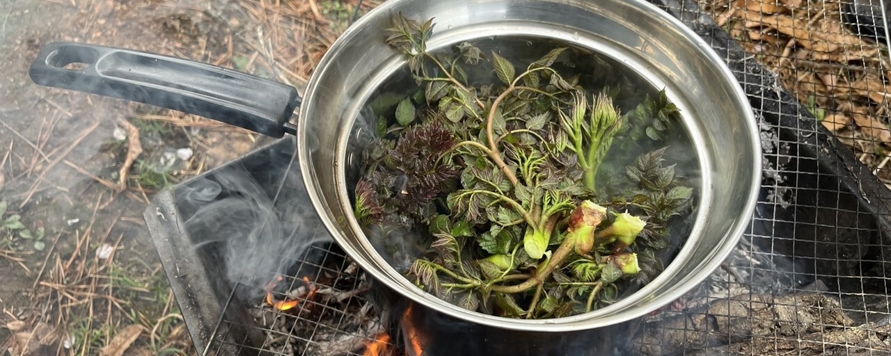 화로에 불판을 놓고 냄비를 얹어 금방 딴 두릅을 데치고 있다.