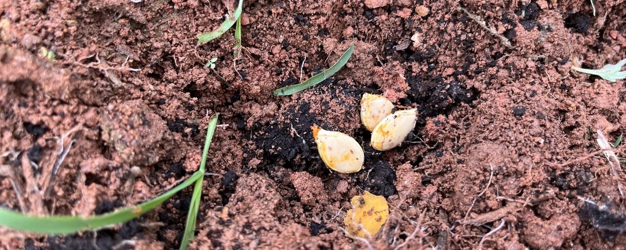 마트에서 산 뉴질랜드 단호박 속을 파내어 얻은 씨앗을 밭에 넉넉하게 넣었다.