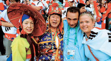 울긋불긋 화려한 응원단 속에서도 ‘이순신’과 ‘어우동’은 단연 돋보였다. 한국-토고, 한국-프랑스, 한국-스위스 매 경기마다 조선의 ‘장군’과 ‘기녀’는 어김없이 관중석에 등장해 꽹과리와 춤사위로 선수들에게 기를 불어넣었다.
