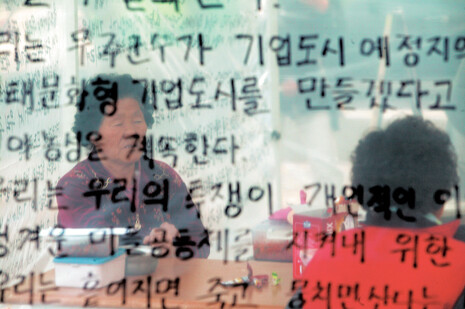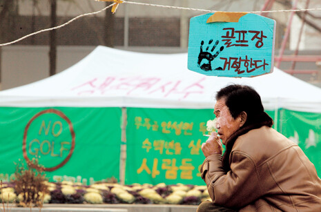 두문리와 덕곡리 주민 300명은 그 뒤 ‘무주골프장기업도시 반대대책위’를 꾸렸다. 그리고 2년 가까운 싸움을 진행하다 1월15일 무주군청 앞에 철야농성용 천막 3개를 세우며 마지막 배수진을 쳤다. 무주군과 대한전선이 계획대로 이달 안에 최종 개발계획서를 기업도시위원회에 올려 개발계획서가 태안군처럼 원안 의결이 되면, 주민들은 마을에서 쫓겨나도 법적으로 아무런 권한이 없다. 기업도시개발특별법은 사업자가 해당 지역 주민들의 땅을 강제 수용할 수 있도록 하고 있기 때문이다.