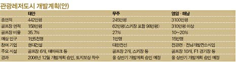 개발계획이 확정된 태안 관광레저도시는 전체 부지 442만 평 가운데 158만 평에 골프장이 들어선다. 35.7%에 이르는 수치다. 모두 6개 108홀의 골프장이 들어선다. 영암·해남 관광레저도시는 전체 땅 3100만 평 가운데 10~20%가 골프장으로 채워질 예정이다. 전체 면적 대비 골프장 비율은 태안보다 낮지만, 규모는 300만 평 이상이어서 단일 지역에 건설되는 ‘골프장군’으로는 국내 최대가 될 것으로 예상된다. 이곳에 건설되는 골프장은 모두 10개, 180홀 이상이다. 무주는 245만 평 가운데 62만 평이 18홀 골프장 2개로 채워진다. 전체 면적 가운데 27%를 차지하고, 자연 녹지를 제외한 ‘개발 면적’ 가운데 50%를 넘는다. 이것도 원래 골프장 3개를 건설하려 했다가 주민들의 반대가 크자 골프장 1개(35만 평)를 스키장으로 변경했다.