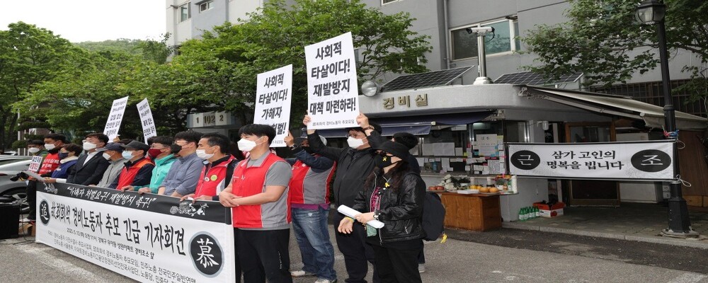 노동사회단체 활동가들이 6월12일 서울 강북구 ㅅ아파트 앞에서 한 달여 전 입주민의 폭력을 견디지 못하고 스스로 목숨을 끊은 경비노동자 최희석씨와 관련해 긴급 기자회견을 하고 있다. 이날 회견은 이 아파트 관리사무소와 일부 주민이 사전 협의가 없었다는 이유로 막아서는 바람에 중단됐다. 한겨레 김봉규 선임기자