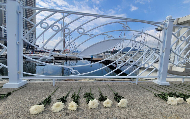 전남 여수시 웅천동 요트 선착장에 홍정운군을 추모하기 위해 놓인 국화. 여수/장예지 한겨레 기자
