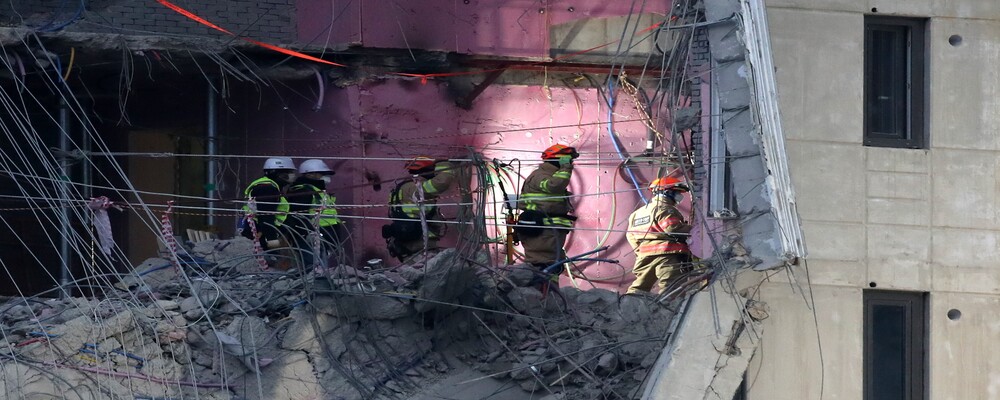 노란 리본이 걸린 철망 너머로 챙 넓은 모자를 눌러쓴 남성의 시선이 머물렀다. 아파트 외벽 콘크리트는 누더기가 된 채 건물에 매달렸고 휜 철근은 거미줄처럼 엉켜 있었다. 광주광역시 서구 화정동 아이파크 아파트 201동. 39층 옥상부터 23층까지 건물 잔해는 얽히고설키며 내려앉았다.