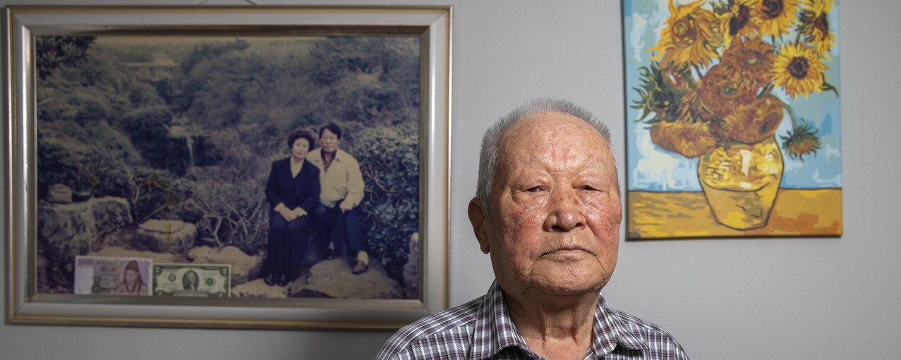 1956년 북한 황해도 고향에서 남한 북파공작원에게 납치된 지 67년 만에 국가의 배상을 받게 된 김주삼(86)씨가 2023년 2월20일 경기도 고양시 자택에서 포즈를 취했다. 벽에는 김씨와 부인 이승자씨 부부의 젊은 시절 사진과 딸이 그린 고흐의 해바라기 정물화가 나란히 걸려 있다.