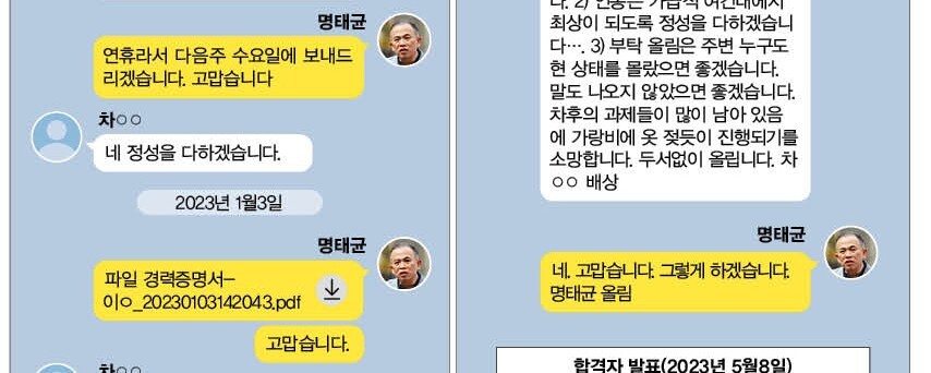 이후 채용 면접이 진행된 지 이틀 후인 4월29일, 차 비서관은 “남명학사는 본인의 자력이 탁월하여 신원조회만을 남겨두고 있습니다”라며 명씨에게 처남 이씨의 합격 소식을 미리 알려준다. 이후 이 채용이 부적절한 과정을 통해서 진행됐음을 암시하는 메시지도 남겼다. “주변 누구도 현 상태를 몰랐으면 좋겠습니다. 말도 안 나왔으면 좋겠습니다.”