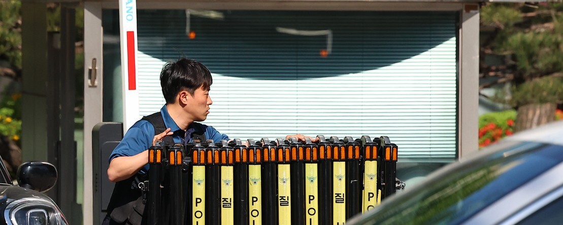 2025년 4월30일 서울 서초구 아크로비스타 앞에서 경찰 관계자가 검찰의 윤석열 집에 대한 압수수색이 끝난 뒤 바리케이드를 치우고 있다. 연합뉴스