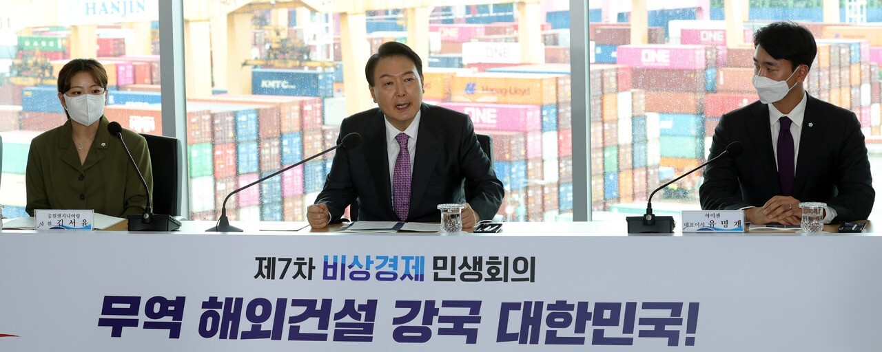 윤석열 대통령이 2022년 8월31일 경남 창원시 진해구 부산신항 한진물류터미널을 방문해 부산신항 시설을 둘러본 뒤 제7차 비상경제민생회의를 주재하고 있다. 대통령실사진기자단