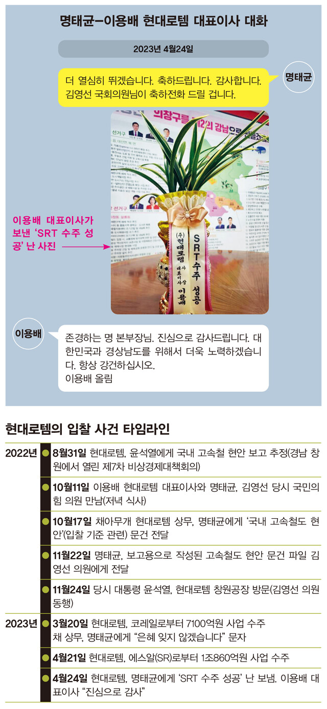 채 상무는 수주가 결정난 당일 명씨에게 “맘(마음) 써주시고 지원해주신 덕분에 좋은 결과 나왔습니다. 정말 감사드립니다. 은혜 잊지 않겠습니다”라는 메시지를 보냈다. 하루 뒤인 3월21일에는 이용배 현대로템 대표이사 명의로 ‘코레일 고속전철 수주를 감축드립니다’라고 적힌 난 화분이 김영선 당시 의원실에 도착했다. 이용배 대표이사가 명씨와 김 의원에게 감사의 의미를 담아 보낸 난 화분으로 추정된다.
