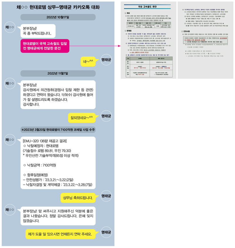 한겨레21이 단독 입수한 명씨의 카카오톡 대화 기록 등 피시(PC) 저장 자료를 보면, 2022년 10월17일 채아무개 현대로템 상무는 명씨에게 ‘국내 고속철도 현안’이라는 제목의 문건을 전송하며 “꼭 좀 부탁드립니다”라는 메시지를 보낸다.