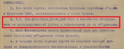제2항. 박진순, 박애, 최고려, 김규식(Ким-Гю-Сек) 동무는 고려공산당이 통합될 때까지 당 사업에 직접 간여함을 금지한다.1
